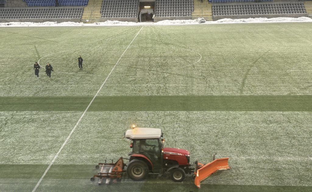 Vaktmästeriet var tvungna att borsta bort snön i halvtidsvilan. Foto: Eskilstunasporten