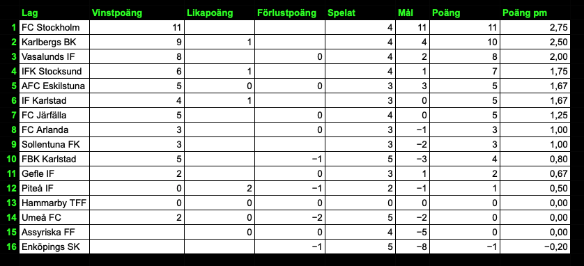 Dessa resultat innebär att försäsongstabellen just nu ser ut på detta vis: